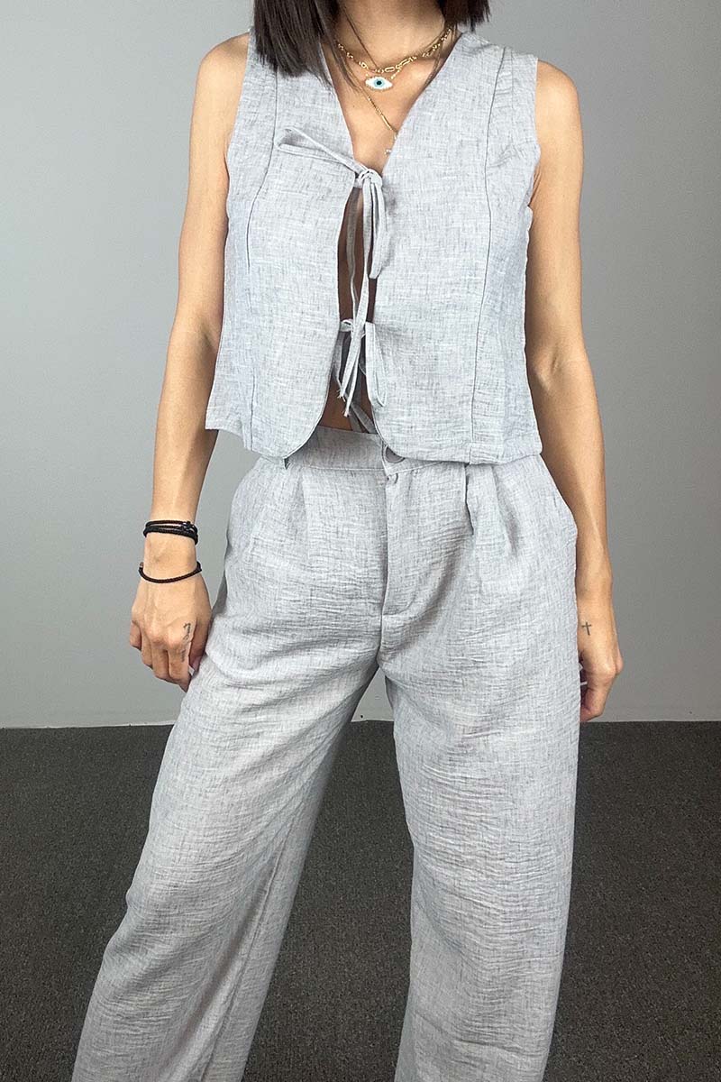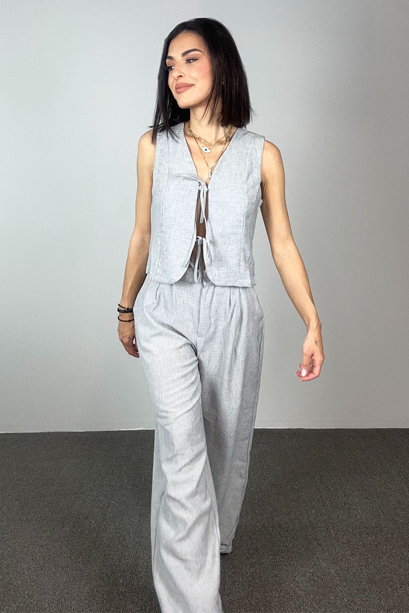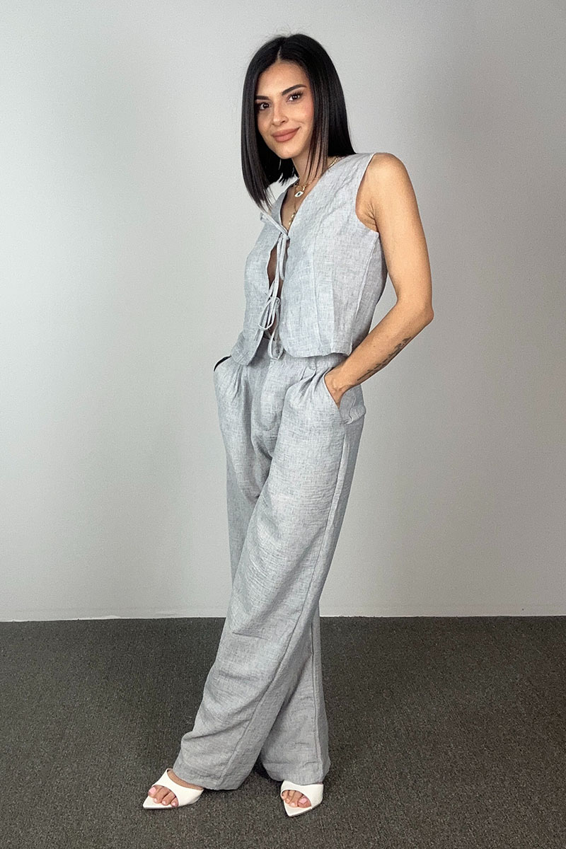 Το Alba Set είναι η ιδανική επιλογή για τις ζεστές ημέρες που θέλεις άνεση χωρίς να θυσιάζεις το στιλ σου. Αποτελείται από αμάνικο top με κορδόνια που δένουν μπροστά και παντελόνι με ίσια γραμμή και λάστιχο στη μέση. Το δροσερό ύφασμα και η χαλαρή εφαρμογή το καθιστούν κατάλληλο για καθημερινές εμφανίσεις στην πόλη, απογευματινές βόλτες ή ακόμα και διακοπές.