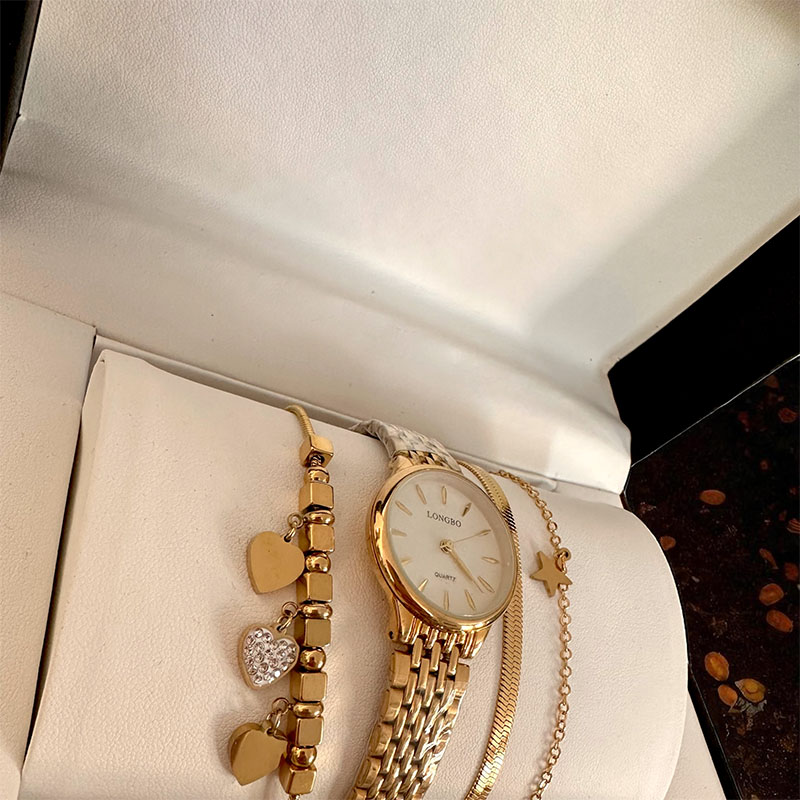 Κομψό σετ που περιλαμβάνει χρυσό ρολόι με λευκό καντράν και τρία βραχιόλια. Το πρώτο διακοσμείται με καρδιές, το δεύτερο με διακριτικές λεπτομέρειες και το τρίτο με αστεράκι. Ένας ρομαντικός και θηλυκός συνδυασμός για κάθε εμφάνιση.