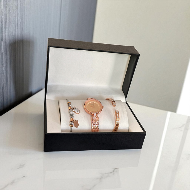Κομψό σετ που περιλαμβάνει ρολόι σε ροζ χρυσό με διακριτικό καντράν και δύο βραχιόλια. Το ένα με minimal γραμμές και το άλλο με σφαιρικά στοιχεία και λαμπερές λεπτομέρειες. Ένας σύγχρονος και θηλυκός συνδυασμός που δίνει λάμψη σε κάθε εμφάνιση.