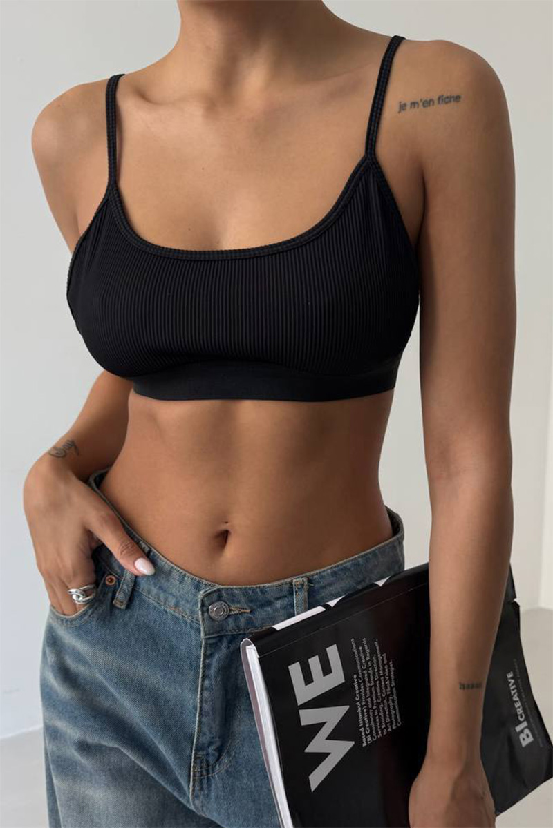 Minimal ribbed bra top με λεπτές τιράντες και ανοιχτή πλάτη. Ελαστικό, άνετο και ιδανικό για καθημερινά looks ή layering.