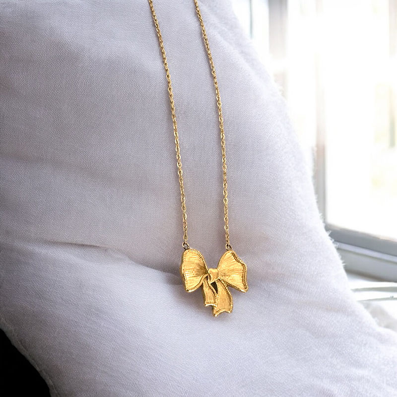 Ρομαντικό και κομψό, το Belle Necklace διαθέτει χρυσό μοτίφ φιόγκου με ανάγλυφη υφή και φίνα αλυσίδα. Ένα θηλυκό και παιχνιδιάρικο κόσμημα που προσθέτει διακριτική λάμψη και vintage αισθητική σε κάθε σύνολο.