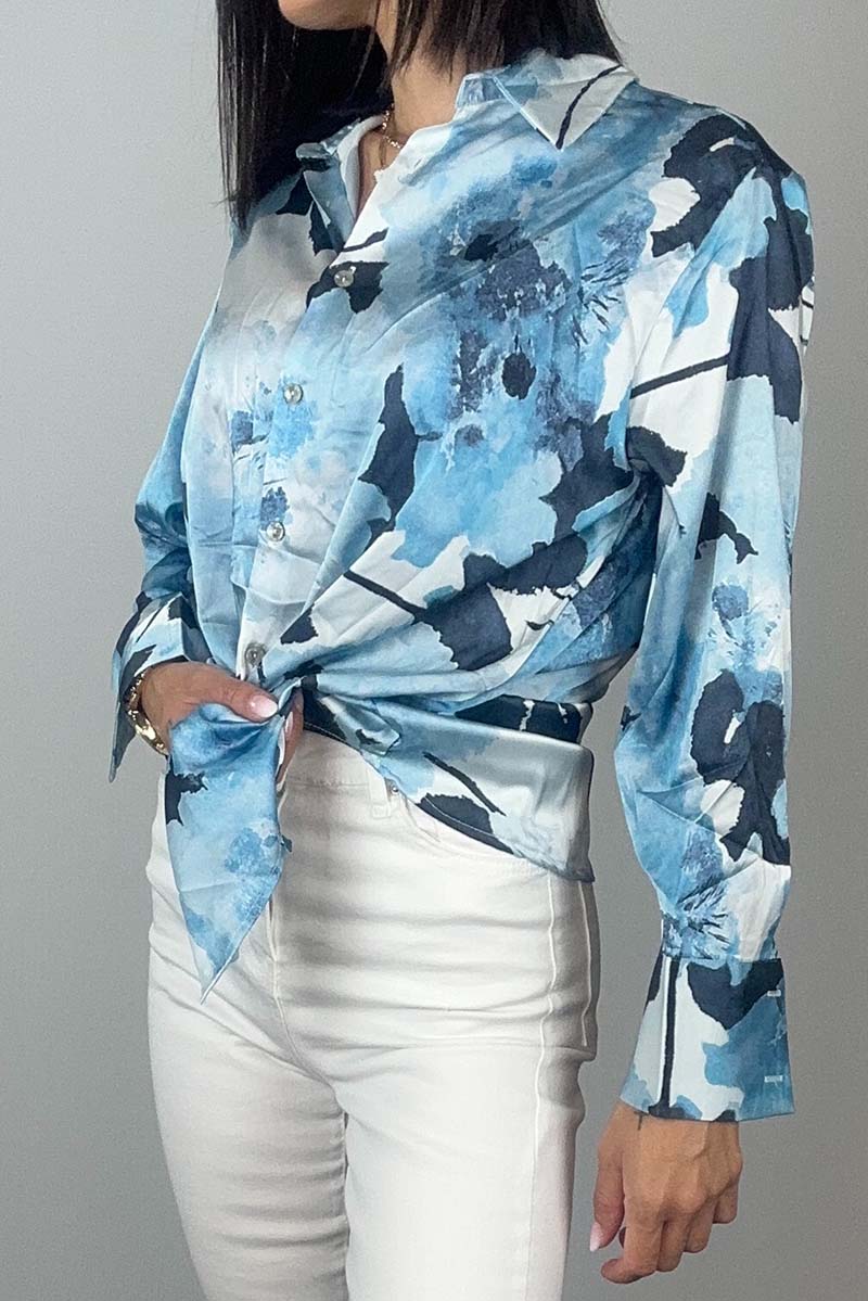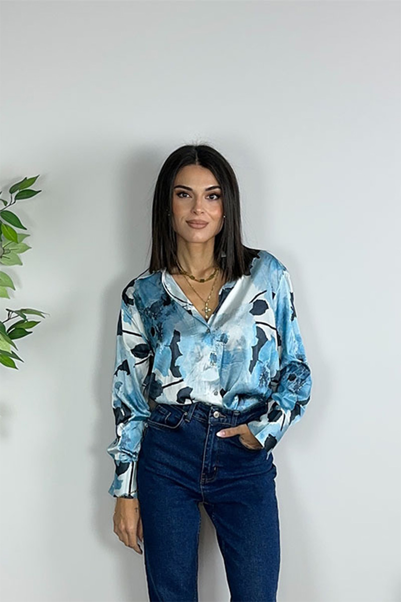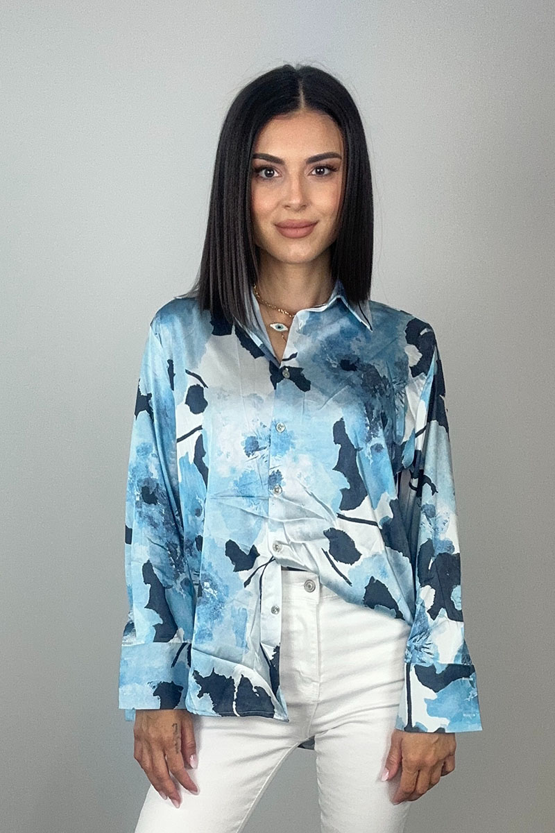 Σατέν πουκάμισο με floral σχέδιο σε αποχρώσεις του μπλε, σε χαλαρή και αέρινη γραμμή. Διαθέτει γιακά, κουμπιά στο μπροστινό μέρος και μακριά μανίκια με διακριτικό άνοιγμα στις μανσέτες. Φοριέται άνετα μέσα στη μέρα ή δεμένο για πιο relaxed εμφανίσεις. Ένα κομμάτι που χαρίζει φρεσκάδα και λάμψη στο look σου.