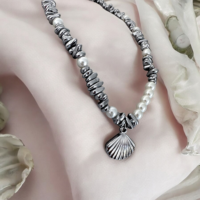 Choker με μεταλλικές χάντρες, λευκές πέρλες και μενταγιόν κοχύλι στο κέντρο. Ένας κομψός συνδυασμός από λάμψη και καλοκαιρινή έμπνευση που φοριέται εύκολα μόνος του ή σε layering.