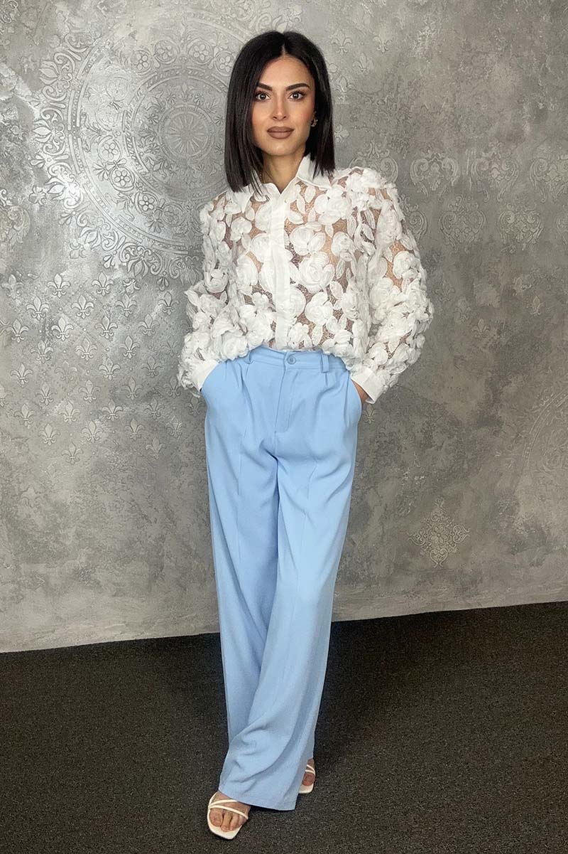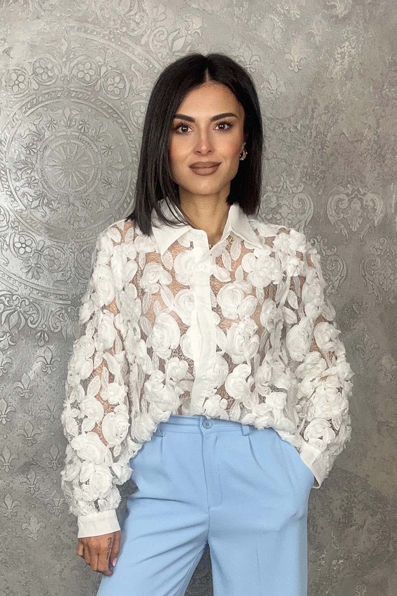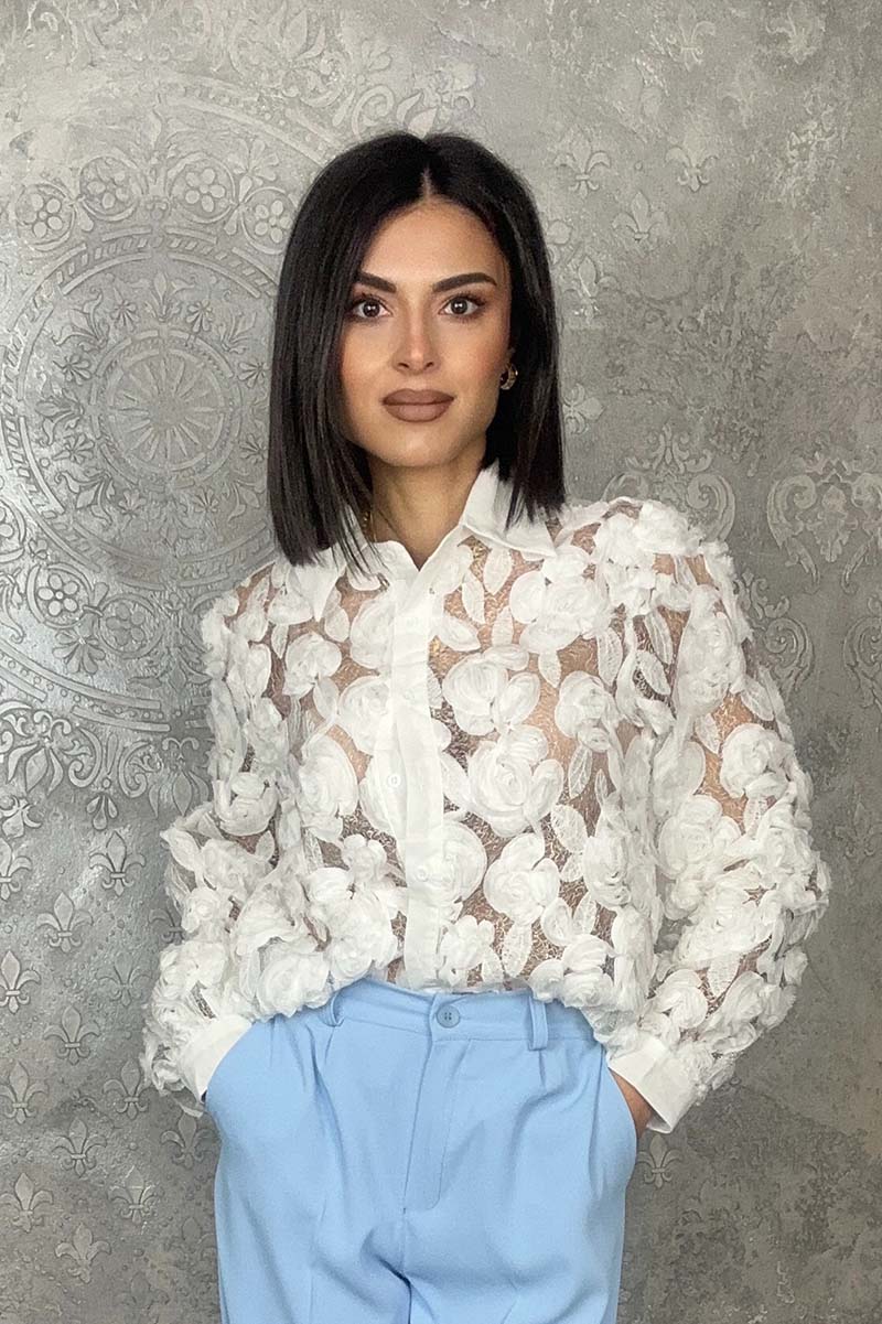 Η απόλυτη romantic statement επιλογή. Το Eden Shirt είναι ένα λευκό διαφανές πουκάμισο διακοσμημένο στο μπροστινό μέρος με ανάγλυφα λουλούδια από δαντέλα που δημιουργούν μια εντυπωσιακή και θηλυκή υφή. Πίσω μέρος τελείως διάφανο, χωρίς λουλούδια, για ένα ανατρεπτικό twist.
