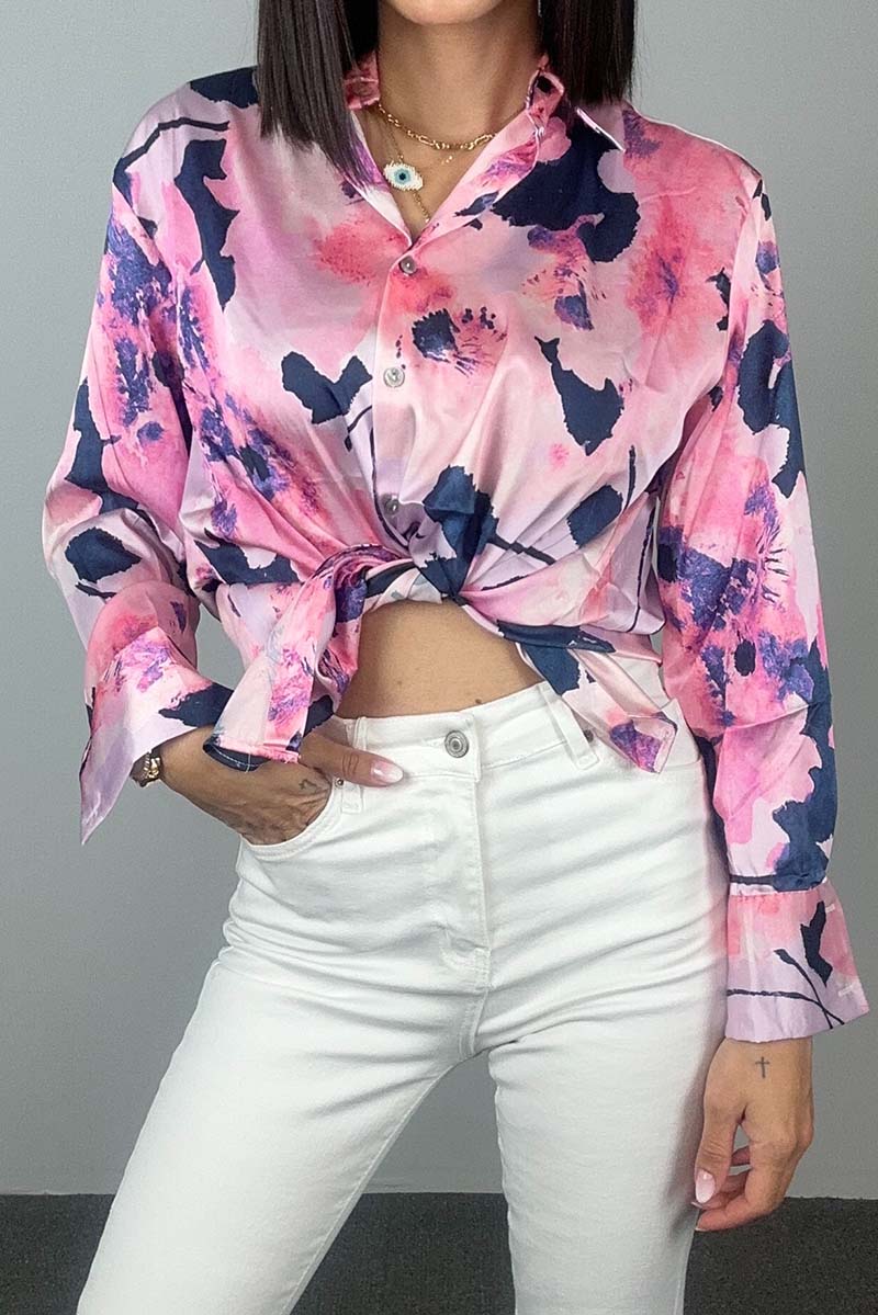 Σατέν πουκάμισο με ροζ και navy floral print σε χαλαρή γραμμή. Διαθέτει μακριά μανίκια, διακριτικό γιακά και κουμπιά στο μπροστινό μέρος. Το λαμπερό του ύφασμα το κάνει ιδανικό τόσο για καθημερινό ντύσιμο με jeans όσο και για πιο ιδιαίτερες εμφανίσεις. Ένα κομμάτι που δίνει χρώμα και χαρακτήρα στο look σου.