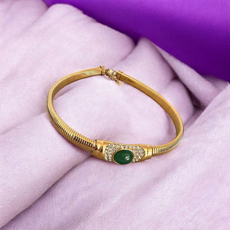Κολιέ με χρυσή μεταλλική βάση τύπου choker και κεντρικό στοιχείο με πράσινη πέτρα και λαμπερες πετρες. Το Emeralda Necklace συνδυάζει αρχοντική κομψότητα με μοντέρνα γραμμή, ιδανικό για ιδιαίτερες εμφανίσεις ή για να απογειώσει ένα απλό outfit με μια μόνο λεπτομέρεια.