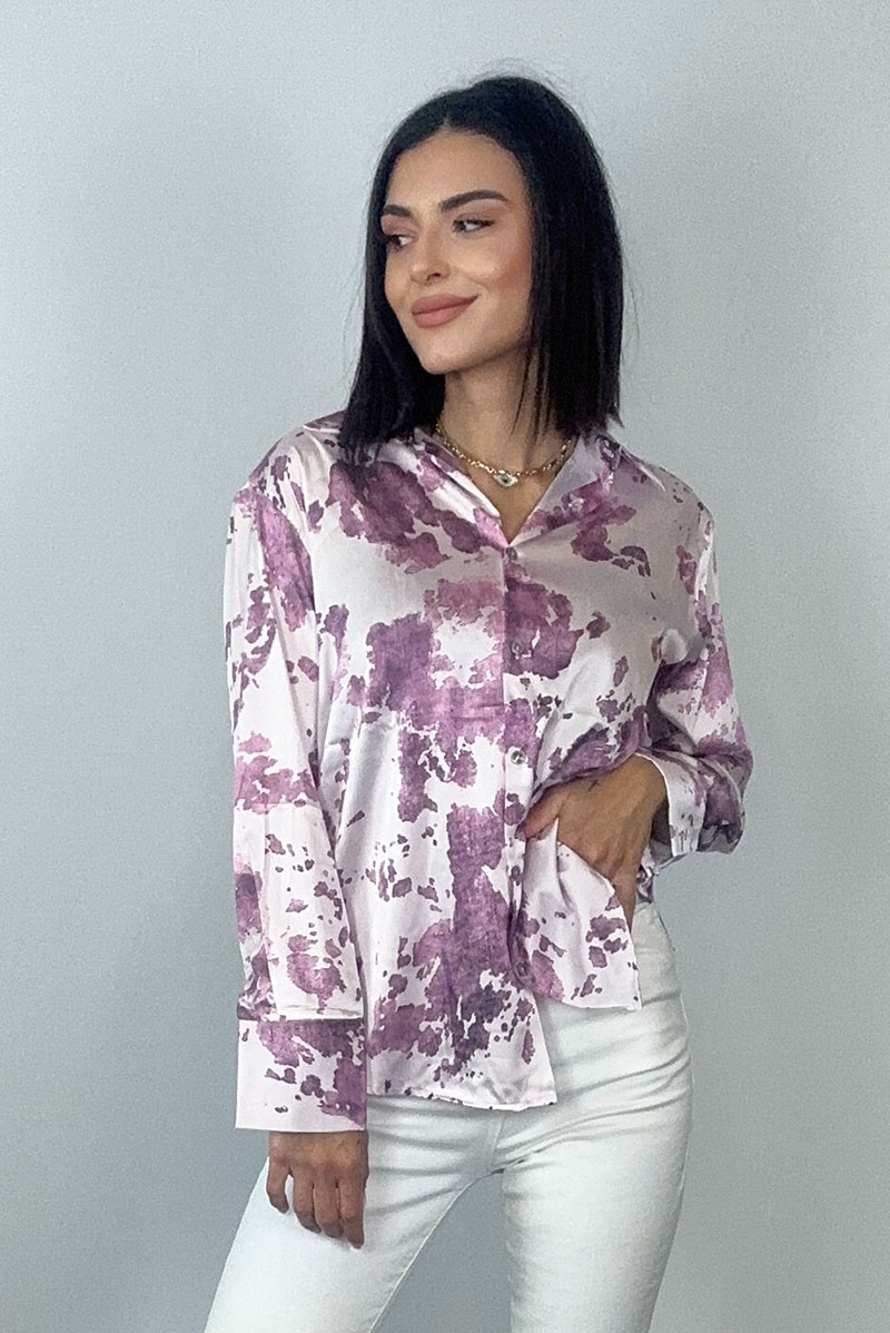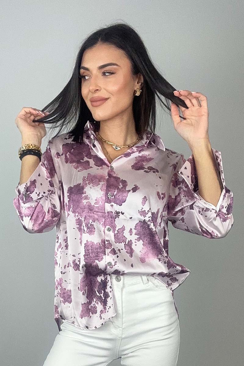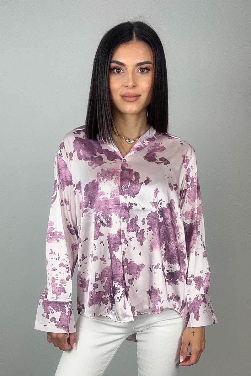 Σατέν πουκάμισο με abstract floral μοτίβο σε αποχρώσεις του λιλά και του μωβ. Χαλαρή γραμμή με μακριά μανίκια, γιακά και κουμπιά στο μπροστινό μέρος.