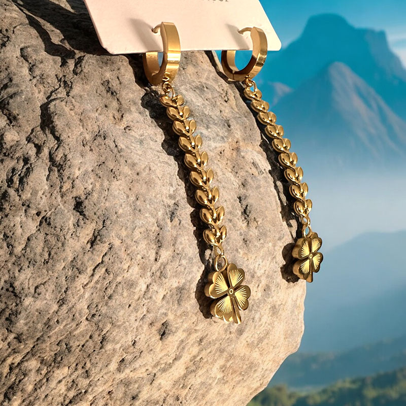 Εντυπωσιακά σκουλαρίκια κρίκοι με κρεμαστή αλυσίδα και τετράφυλλο τριφύλλι στο τελείωμα. Ένα διακριτικό statement κομμάτι που φέρνει τύχη και στυλ σε κάθε εμφάνιση.