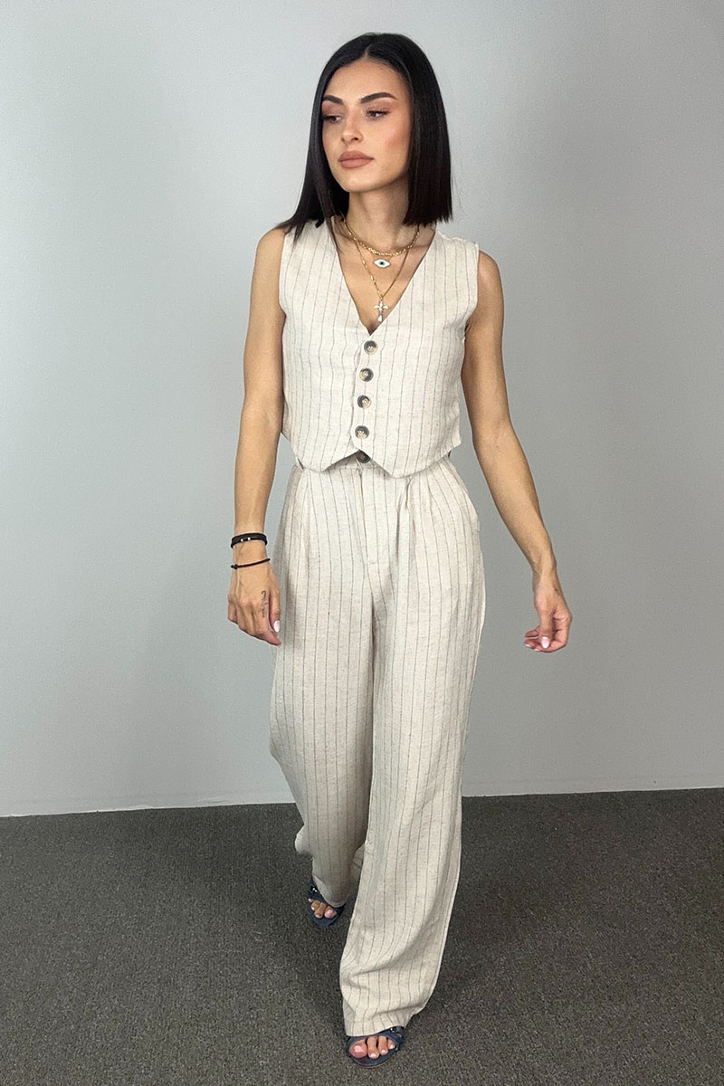 Το Nero Set συνδυάζει διαχρονική γραμμή με κομψές λεπτομέρειες. Το σετ αποτελείται από γιλέκο με κουμπιά και παντελόνι με φαρδιά, άνετη γραμμή. Το ύφασμα του είναι μπεζ με διακριτική κάθετη μπλε ρίγα, προσφέροντας ανάλαφρη υφή και elegant αποτέλεσμα. Το παντελονι εχει λαστιχο στη μεση.