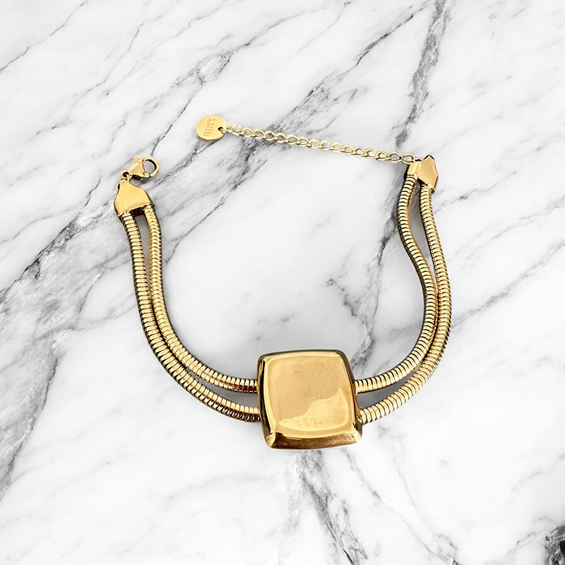 Το Noma Bracelet είναι statement και εκλεπτυσμένο. Με μεταλλικό τετράγωνο κέντρο και διπλή snake αλυσίδα, ξεχωρίζει για την αρχιτεκτονική του φόρμα και τον μοντέρνο χαρακτήρα του. Φοριέται μόνο του ή σε συνδυασμό με άλλα chunky pieces.