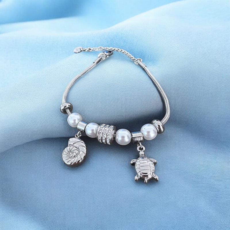 Το Oceana Bracelet συνδυάζει περλέ χάντρες, λαμπερά μεταλλικά στοιχεία και χαριτωμένα θαλάσσια charms όπως το κοχύλι και η χελωνίτσα. Ένα παιχνιδιάρικο και κομψό βραχιόλι που αποπνέει καλοκαιρινή διάθεση και ανεμελιά.