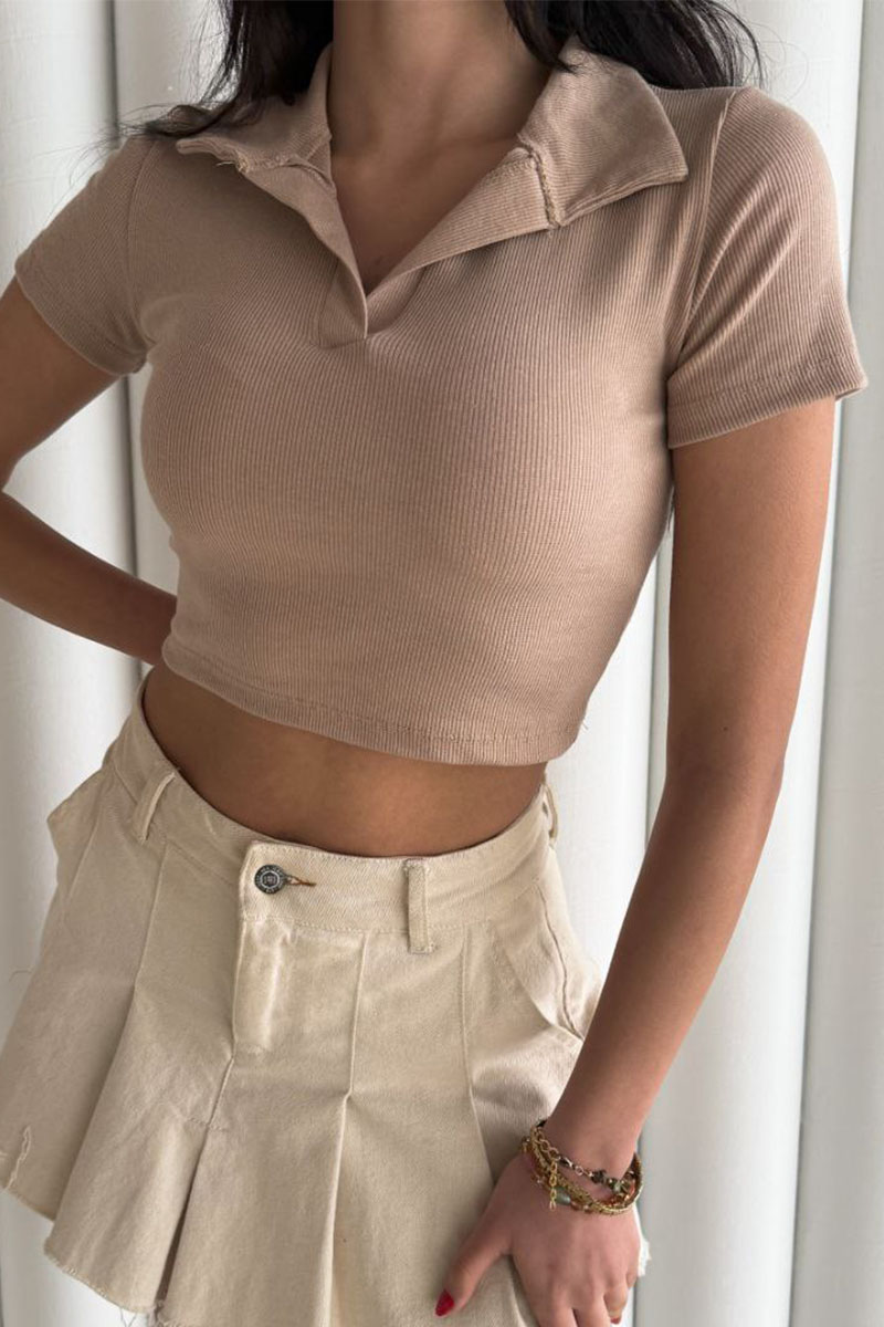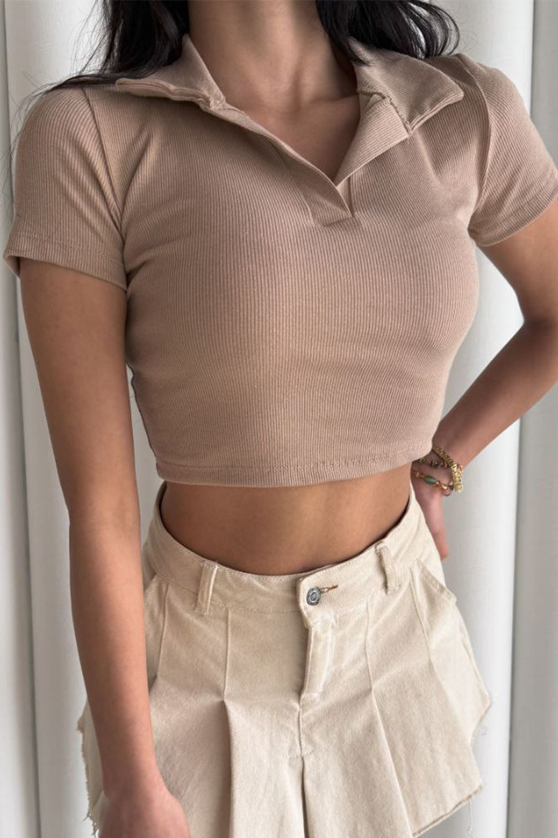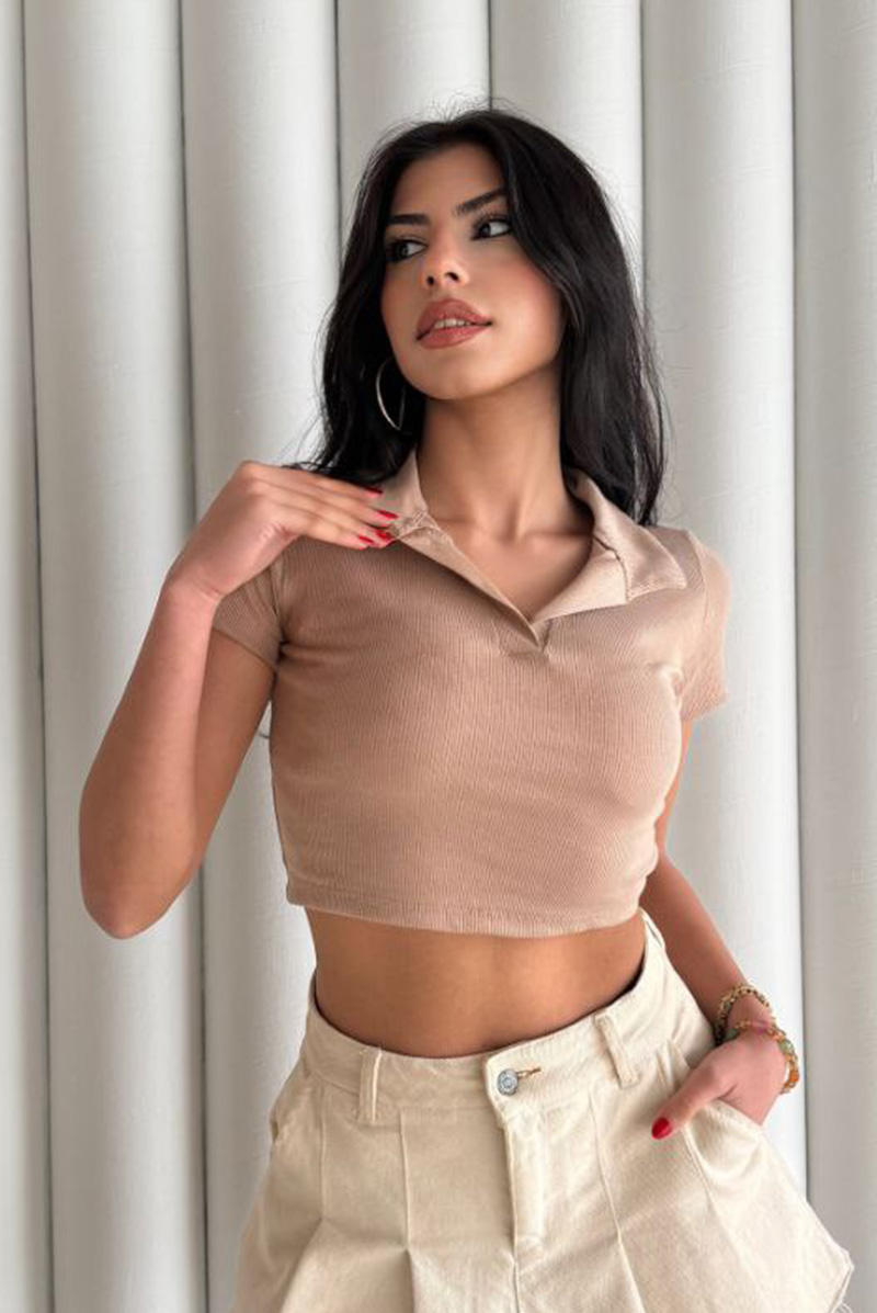 Cropped μπλουζάκι με γιακά και κοντό μανίκι, σε εφαρμοστή γραμμή που αγκαλιάζει το σώμα. Από μαλακό, ελαστικό ύφασμα, με διακριτικό άνοιγμα στο ντεκολτέ και αθλητικό twist.