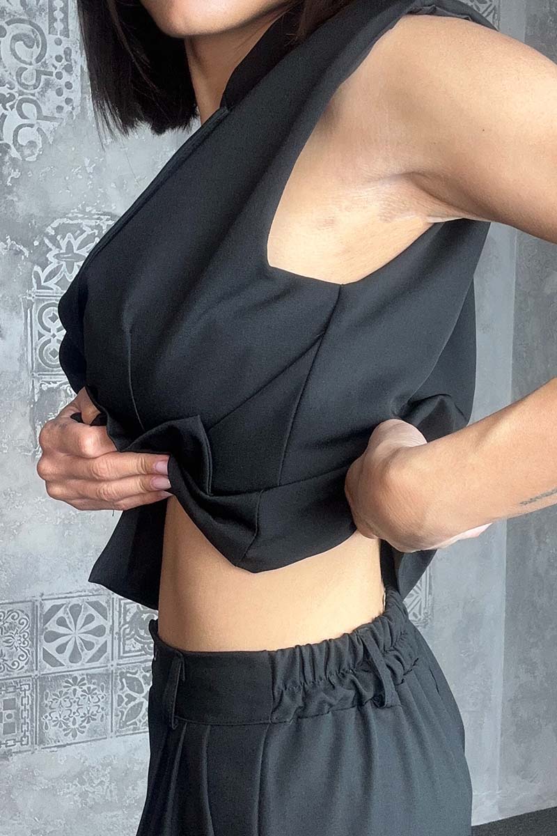 Το Power Elegance Set ενσαρκώνει τη μοντέρνα εκδοχή του δυναμικού στυλ. Το cropped γιλέκο με έντονο γιακά και χρυσό διακοσμητικό κουμπί αποπνέει αυτοπεποίθηση, ενώ το ψηλόμεσο wide-leg παντελόνι προσθέτει κίνηση και κομψότητα σε κάθε σου βήμα.