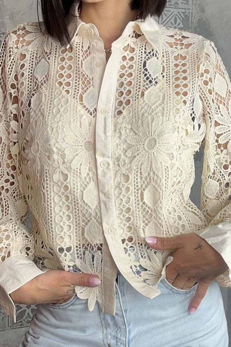 Το Serena Beige είναι ένα διαχρονικό και ρομαντικό πουκάμισο σε στενή γραμμή, που αναδεικνύει τη θηλυκότητα με έναν αριστοκρατικό τρόπο. Το ανάγλυφο δαντελένιο ύφασμα με τα περίτεχνα μοτίβα προσθέτει κομψότητα και χαρακτήρα, ενώ η φυσική μπεζ απόχρωση το καθιστά ευκολοφόρετο και σοφιστικέ.