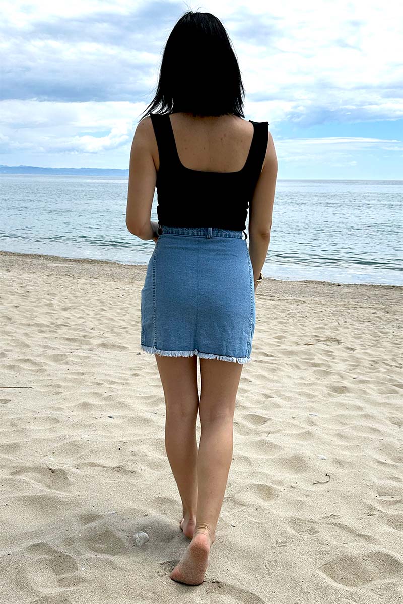 Μίνι φούστα από ανοιχτό denim με ασύμμετρο κλείσιμο και διακριτικό σκίσιμο στο μπροστινό μέρος. Διαθέτει κλασικές τσέπες και ελαφρώς φθαρμένο τελείωμα για μια ανεπιτήδευτα μοντέρνα εμφάνιση.