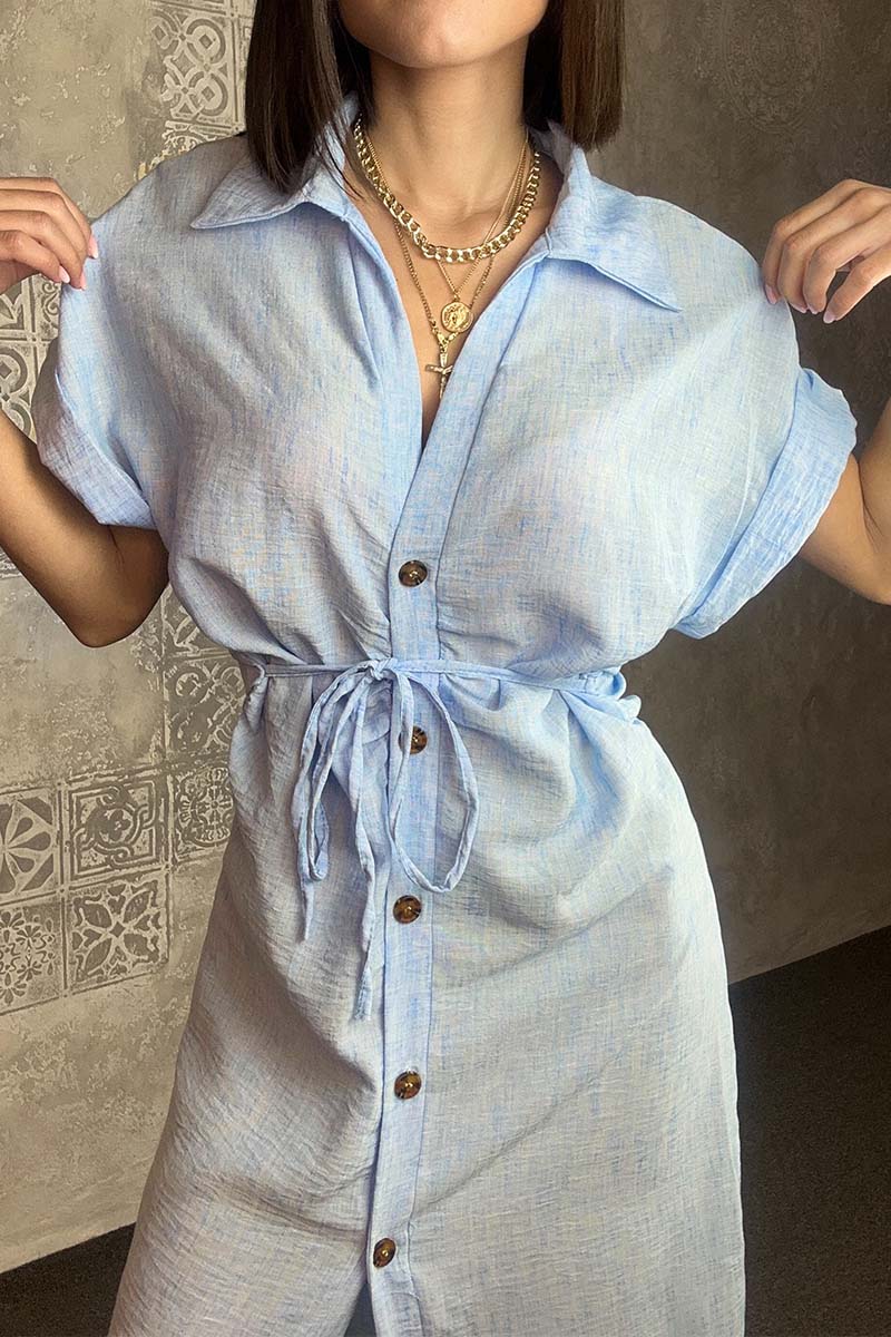 Ανακάλυψε το Dune Dress – Sky edition, το απόλυτο shirt dress του καλοκαιριού που εντυπωσιάζει με την απλότητά του και τις styling επιλογές του. Με κουμπιά σε όλο το μήκος, κομψά γυριστά μανίκια και ανάλαφρη γραμμή, μπορεί να δεθεί είτε μπροστά για casual cool vibes, είτε πίσω για πιο κομψό αποτέλεσμα.