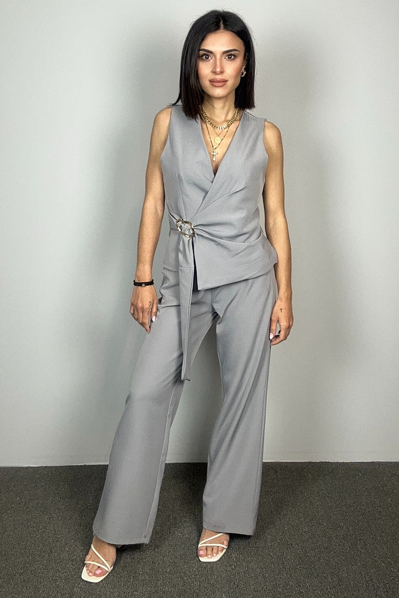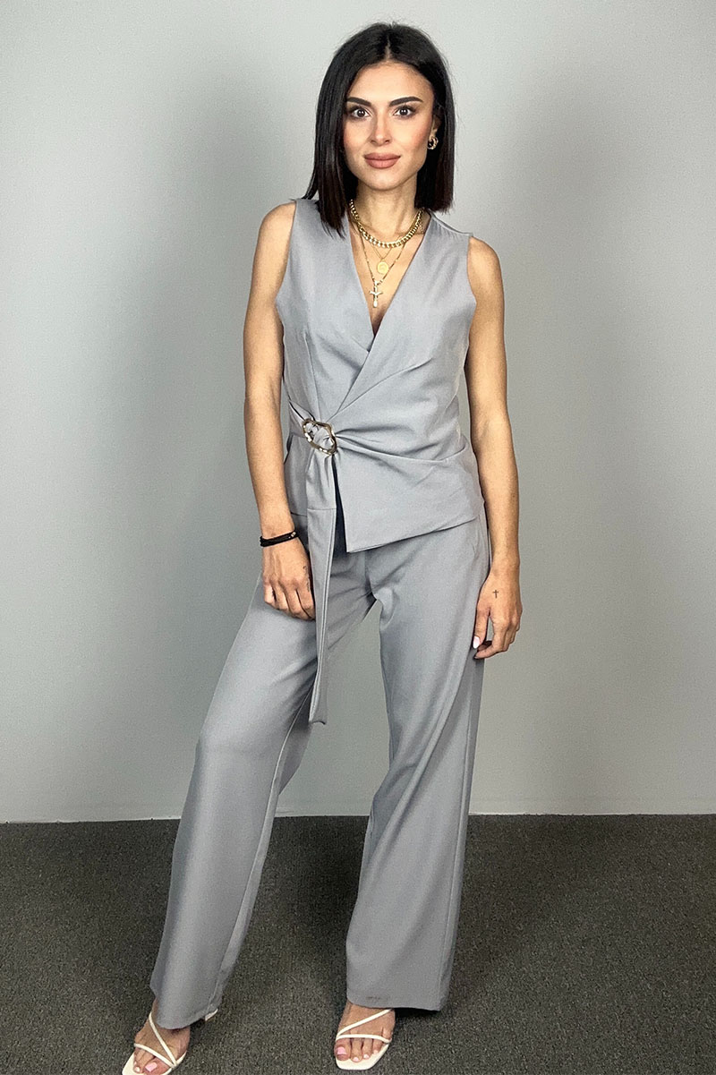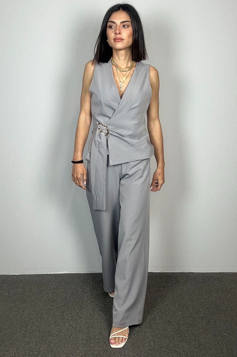 Το Slate Set αποπνέει την κομψότητα της σιγουριάς και τη δύναμη της απλότητας. Σε έναν ουδέτερο γκρι τόνο που ταιριάζει με όλα, το σετ αυτό είναι φτιαγμένο για τη γυναίκα που θέλει να ξεχωρίζει διακριτικά. Το wrap-style top δένει εσωτερικά με κορδονάκι και τονίζεται από τη χρυσή αγκράφα που λειτουργεί σαν διακριτικό statement. Το παντελόνι έχει άνετη ίσια γραμμή με λάστιχο στη μέση για εύκολη εφαρμογή και κίνηση.