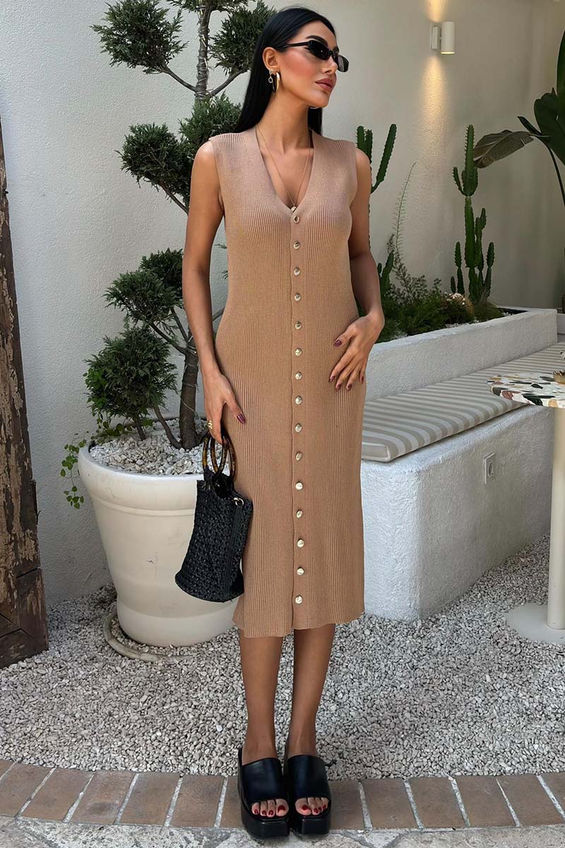 Η caramel εκδοχή του Soleil Knit Dress είναι η πιο ουδέτερη και κομψή επιλογή της σειράς. Με minimal αισθητική και λεπτομέρειες από κουμπιά, το πλεκτό αυτό φόρεμα αποπνέει διακριτική πολυτέλεια. Αγκαλιάζει το σώμα χωρίς να πιέζει, προσφέροντας άνεση και στυλ από το πρωί ως το βράδυ.