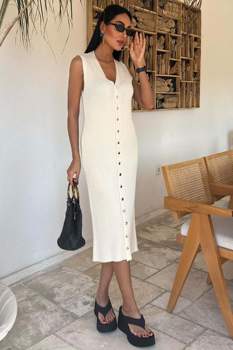 Το Soleil Knit Dress σε εκρου απόχρωση είναι το απόλυτο φόρεμα για καλοκαιρινή κομψότητα με διαχρονικό χαρακτήρα. Πλεκτό, ελαστικό και με κουμπιά σε όλο το μήκος, αγκαλιάζει το σώμα με θηλυκότητα και άνεση. Η καθαρή γραμμή του το καθιστά ιδανικό για καθημερινές αλλά και πιο ιδιαίτερες εμφανίσεις.