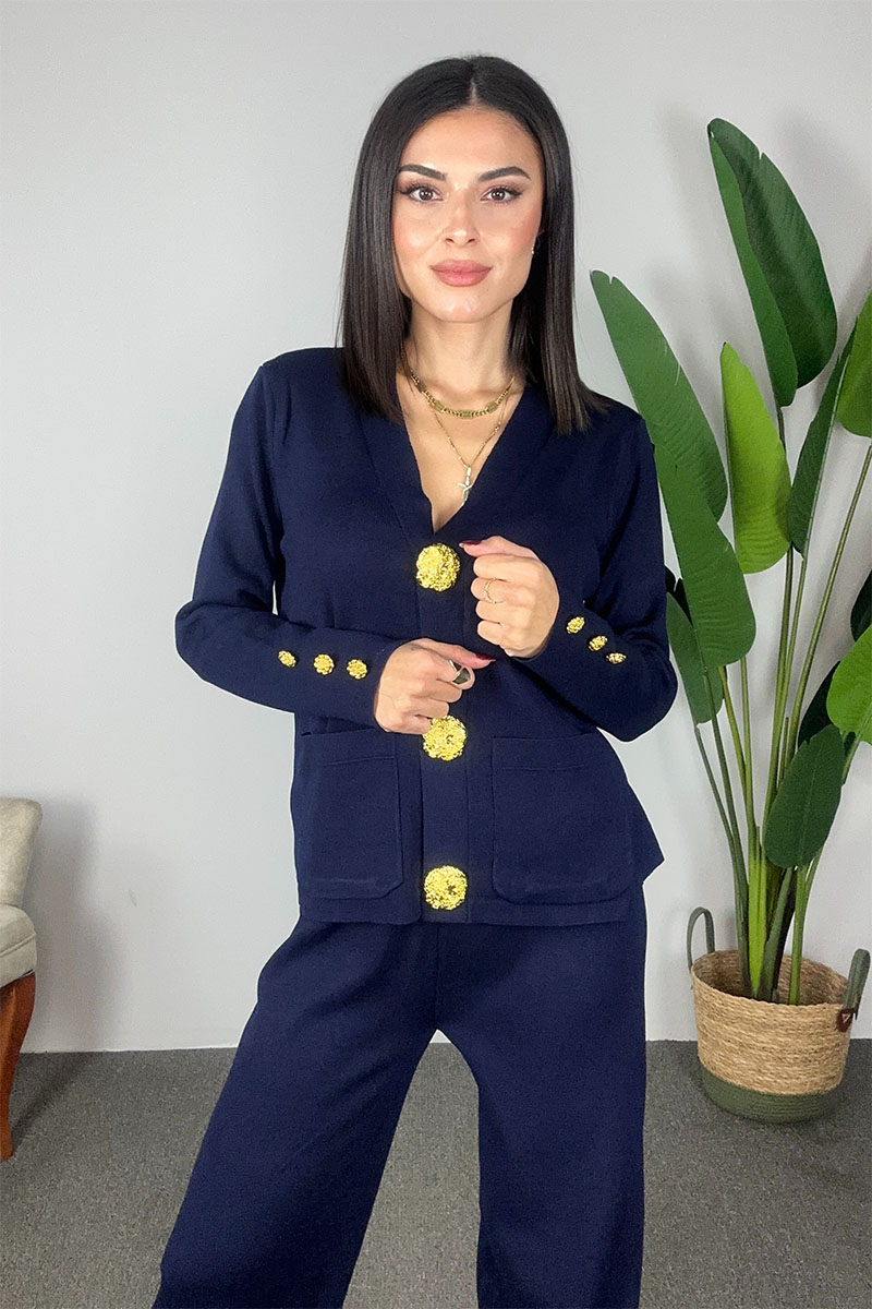 Το Sorrento Knit Set συνδυάζει τη ζεστασιά του πλεκτού με τη διαχρονική κομψότητα. Η ζακέτα-σακάκι διαθέτει εντυπωσιακά χρυσά κουμπιά και V λαιμόκοψη, που αναδεικνύουν τη θηλυκότητα μέσα από minimal γραμμή. Το ίσιο παντελόνι αγκαλιάζει απαλά το σώμα, προσφέροντας άνεση και στυλ σε κάθε στιγμή της ημέρας.