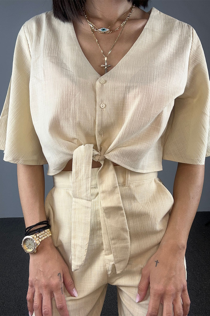 Το Zahara Set είναι ένα ευέλικτο και ανάλαφρο σετ, ιδανικό για τις ανοιξιάτικες και καλοκαιρινές εμφανίσεις σου, από το πρωί μέχρι το βράδυ. Το cropped πουκάμισο με φαρδιά μανίκια και δέσιμο μπροστά συνδυάζει κομψότητα και άνεση, ενώ το παντελόνι σε ίσια γραμμή προσφέρει διαχρονική γραμμή και ελευθερία κινήσεων.